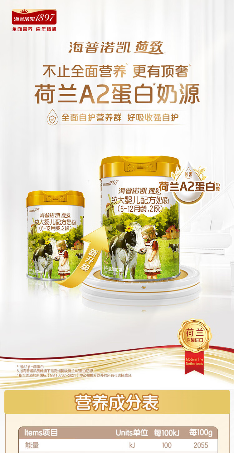 海普诺凯1897荷致A2蛋白*奶源版较大婴儿奶粉2段(6-12月)800g*6罐【顶奢升级】