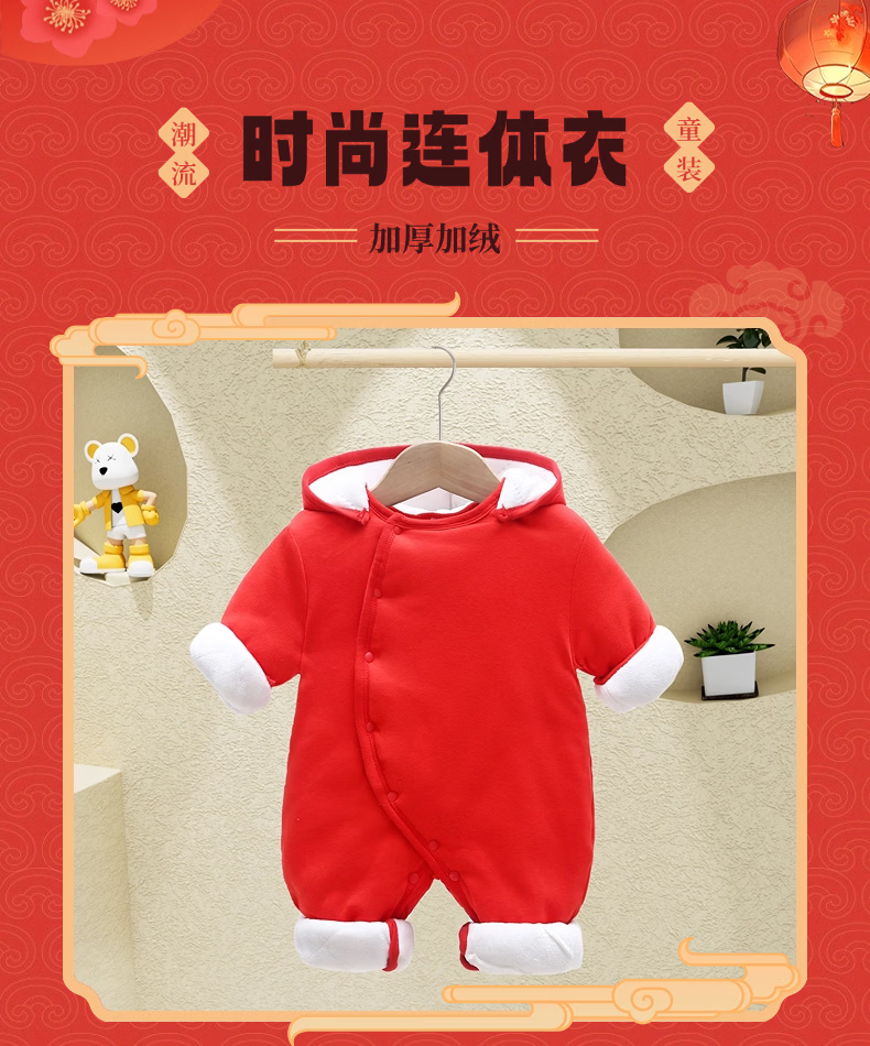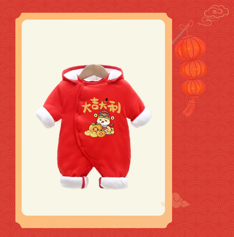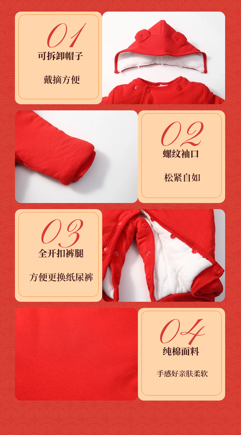 优娜逗新生婴儿衣服新年套装春秋冬薄宝宝满月百天周岁抓周拜年送礼礼袋 大红023四件套【图案定制】 90cm 适合20-25斤左右