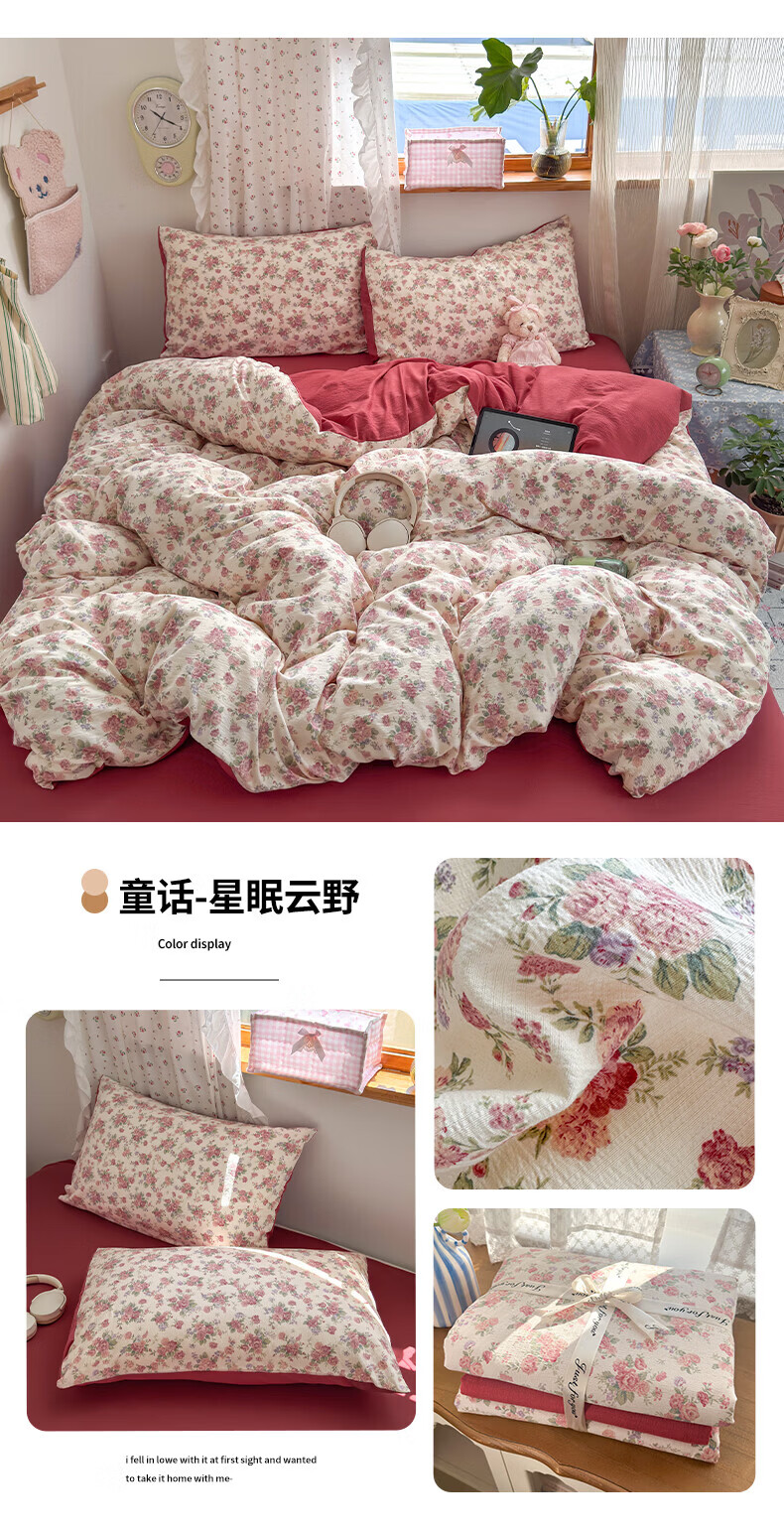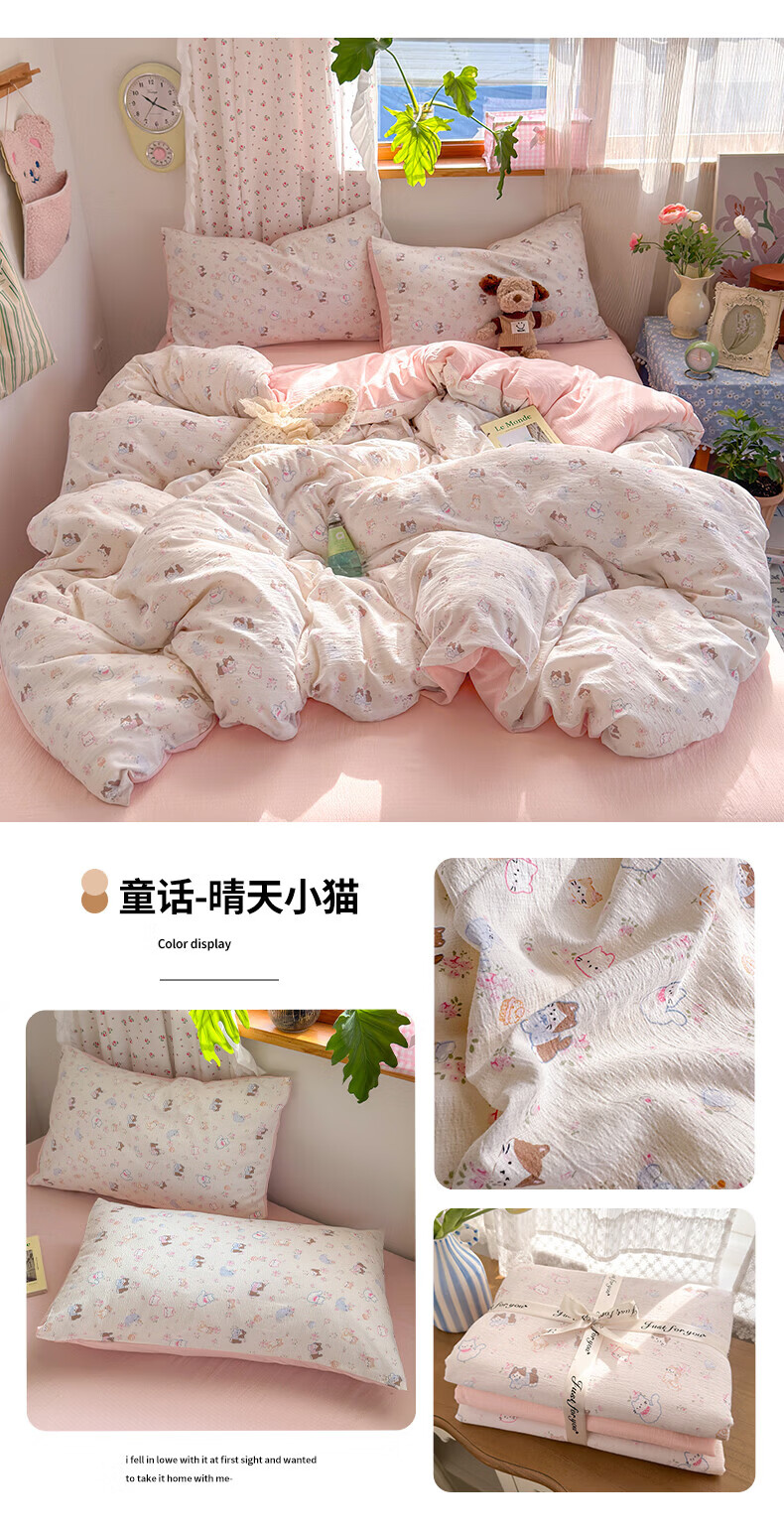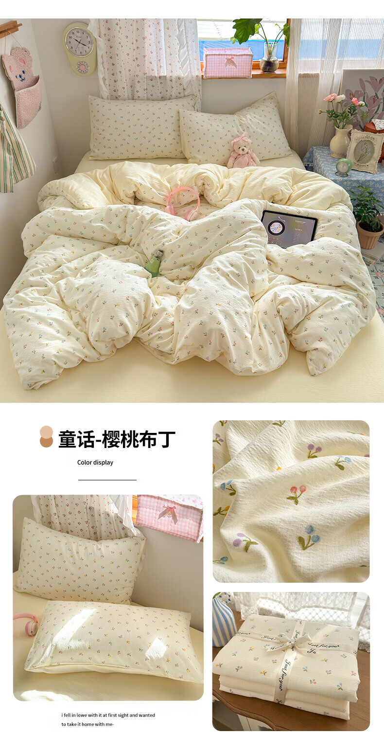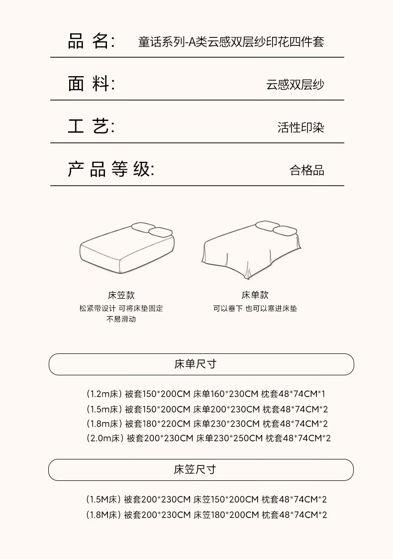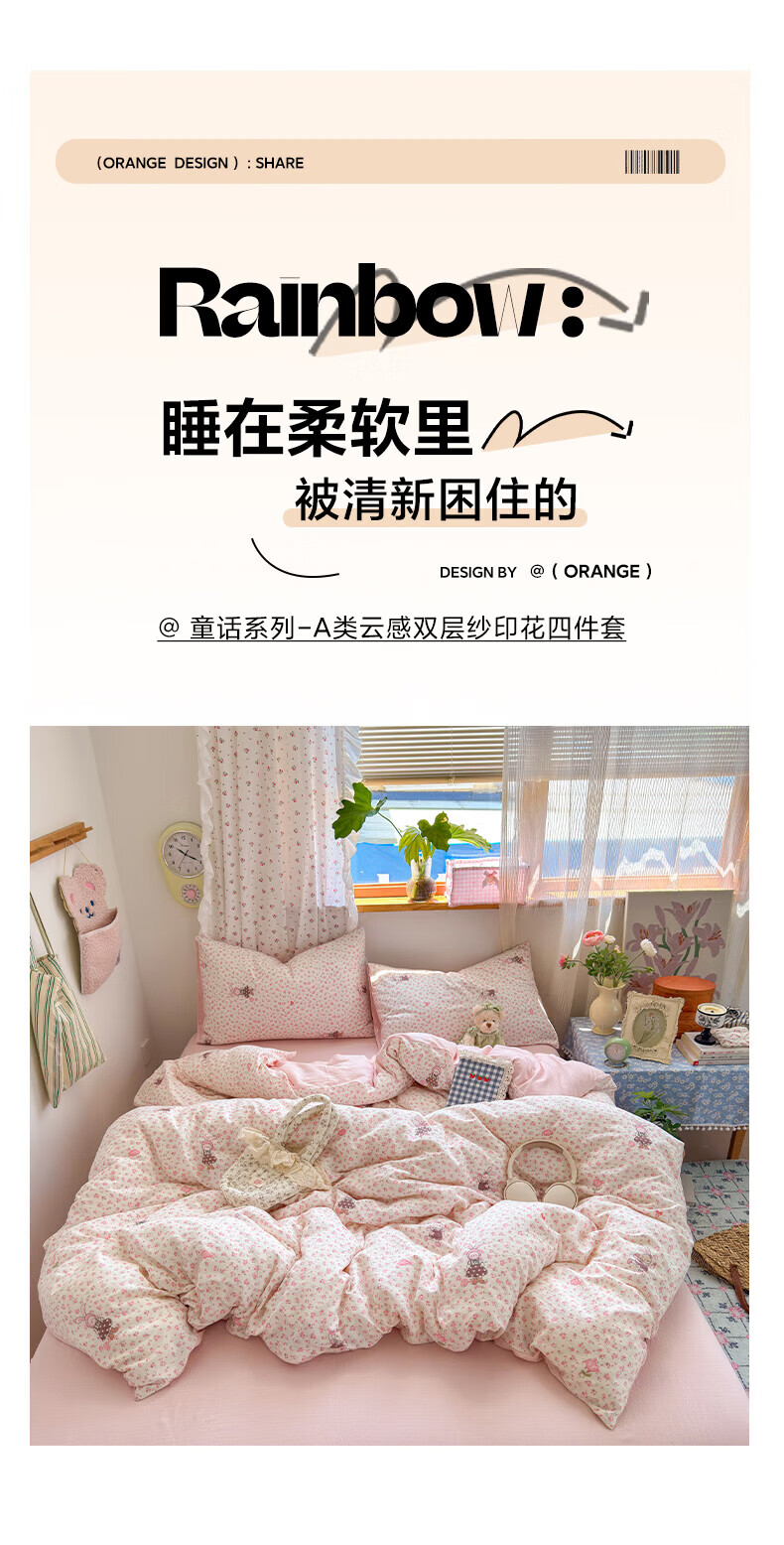 一默四件套被套床单床笠枕套A类可裸睡床上用品云感双层纱印花四件套 樱桃布丁 2.0m 床单款 (被套200*230cm) 四件套