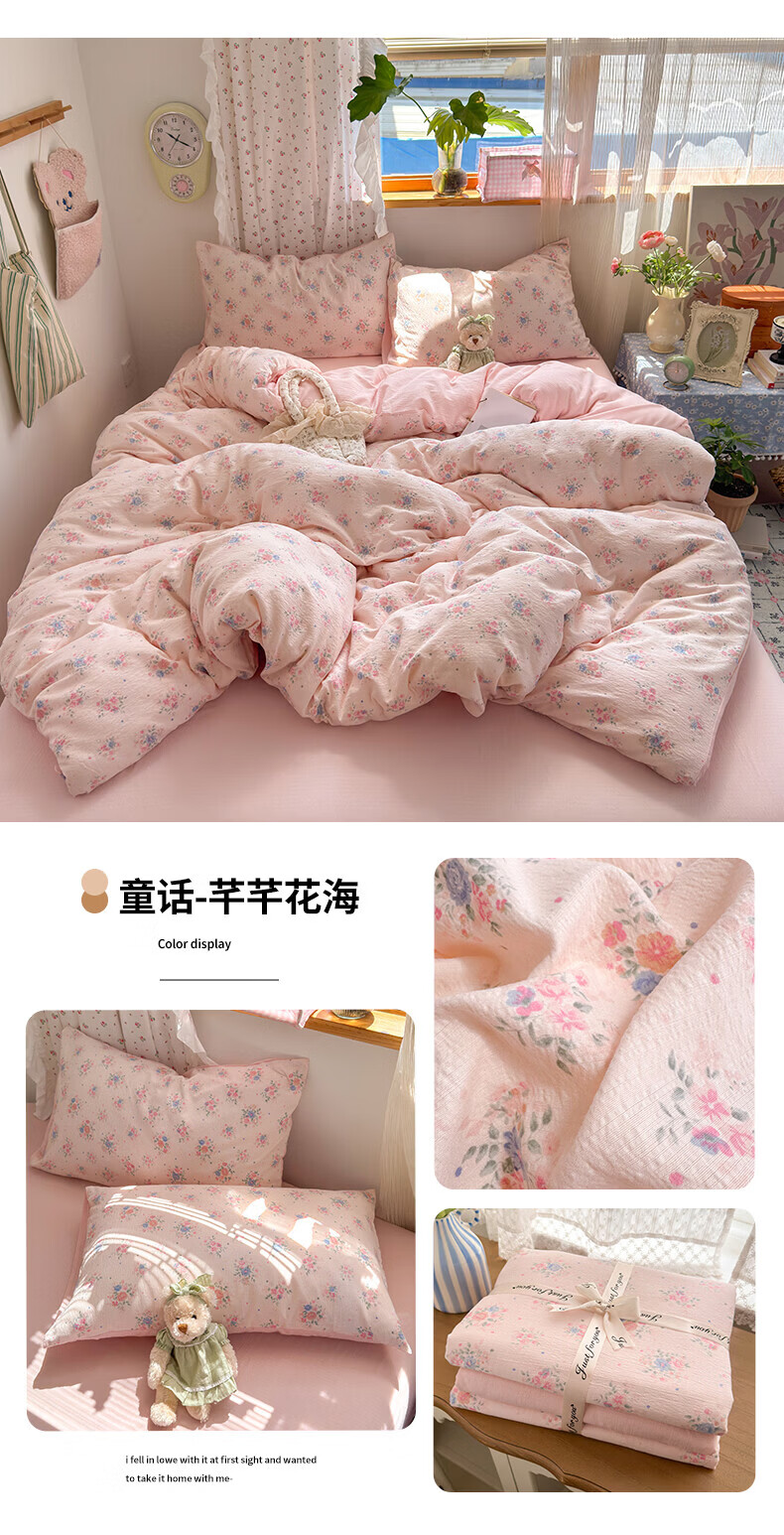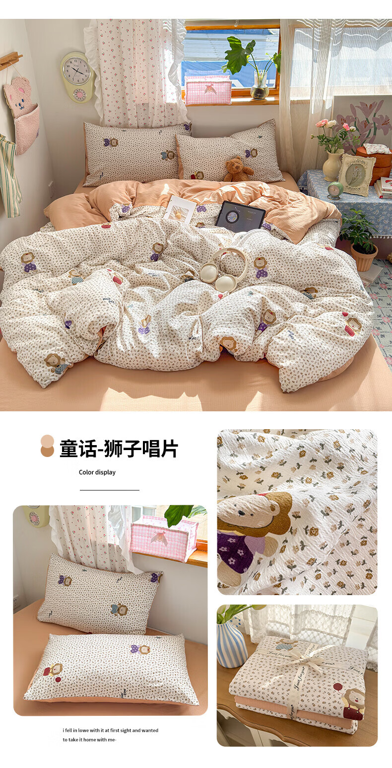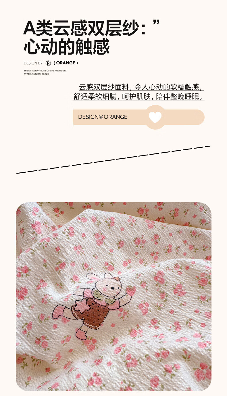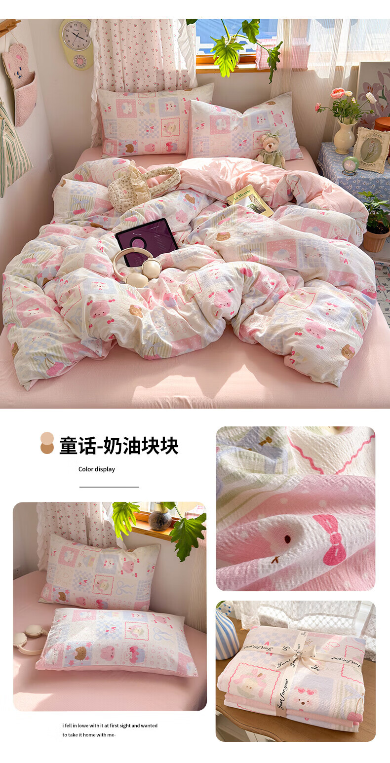 一默四件套被套床单床笠枕套A类可裸睡床上用品云感双层纱印花四件套 樱桃布丁 2.0m 床单款 (被套200*230cm) 四件套