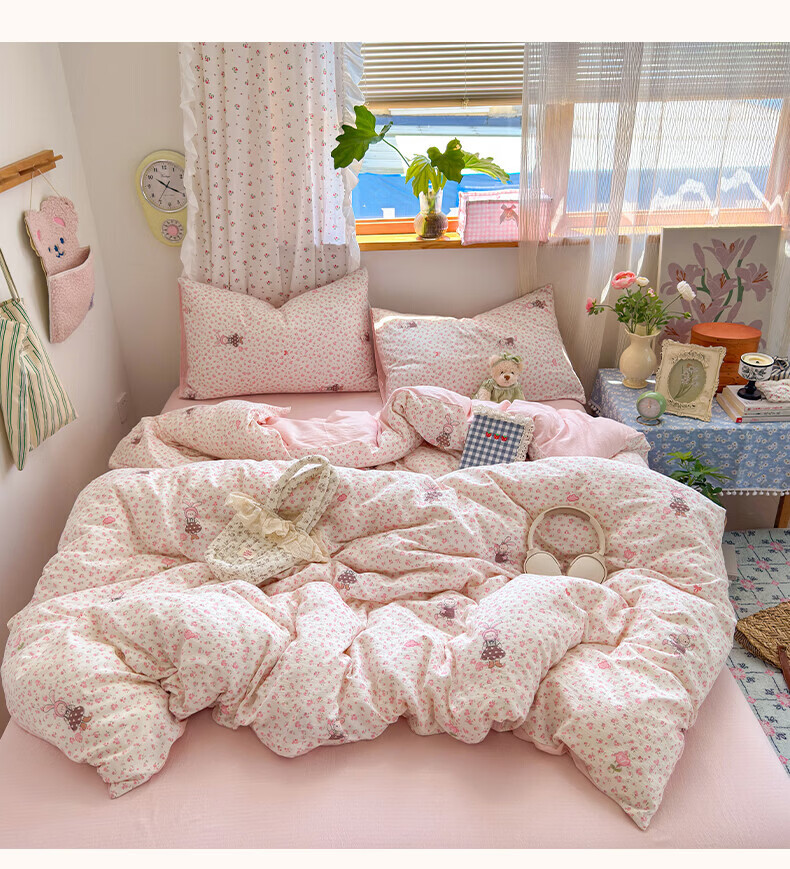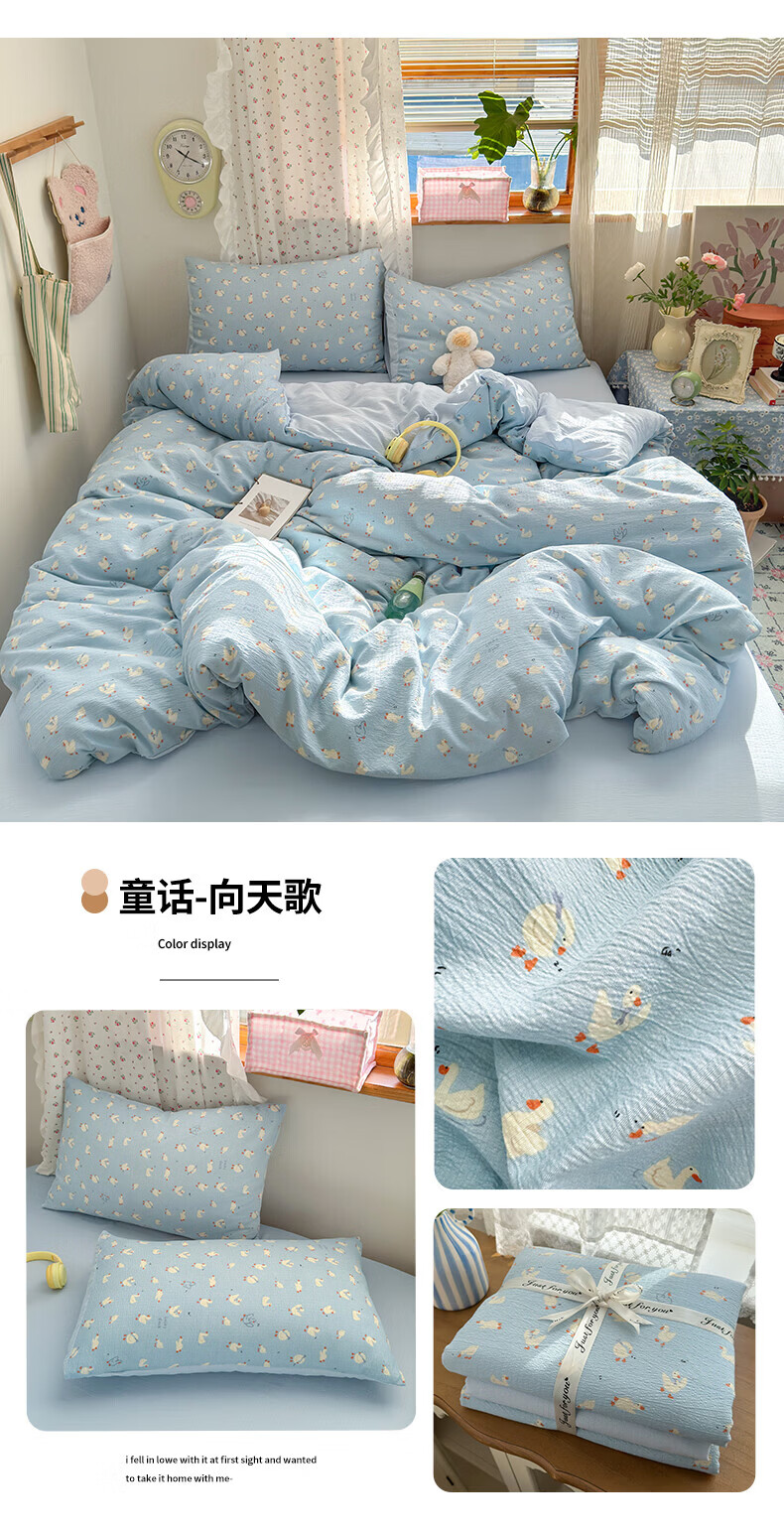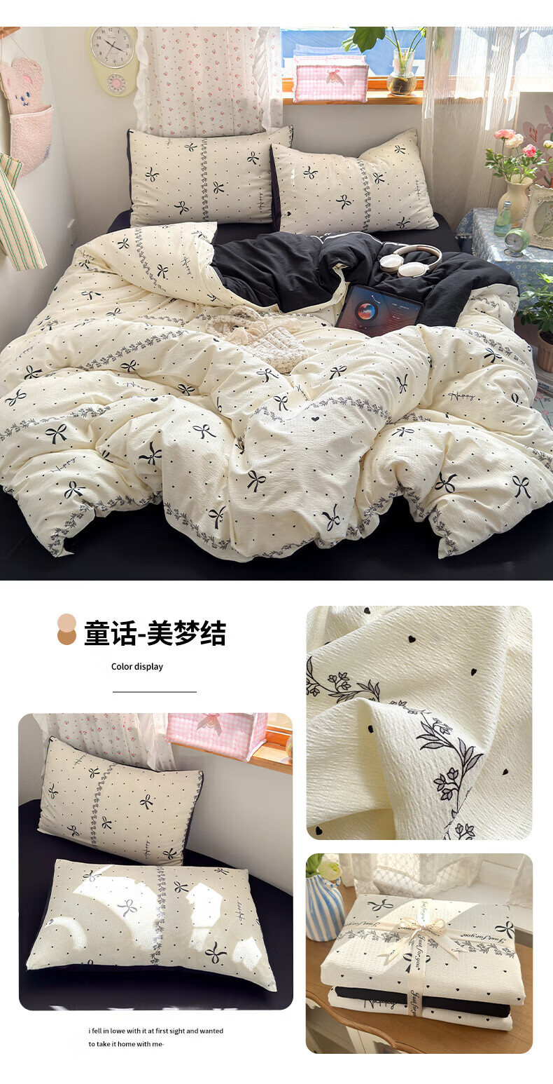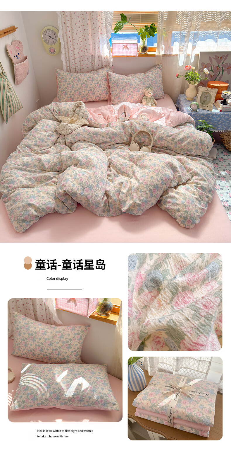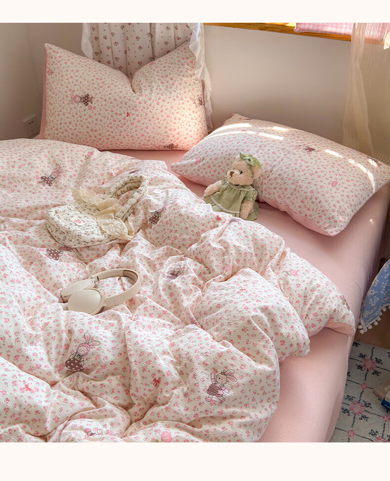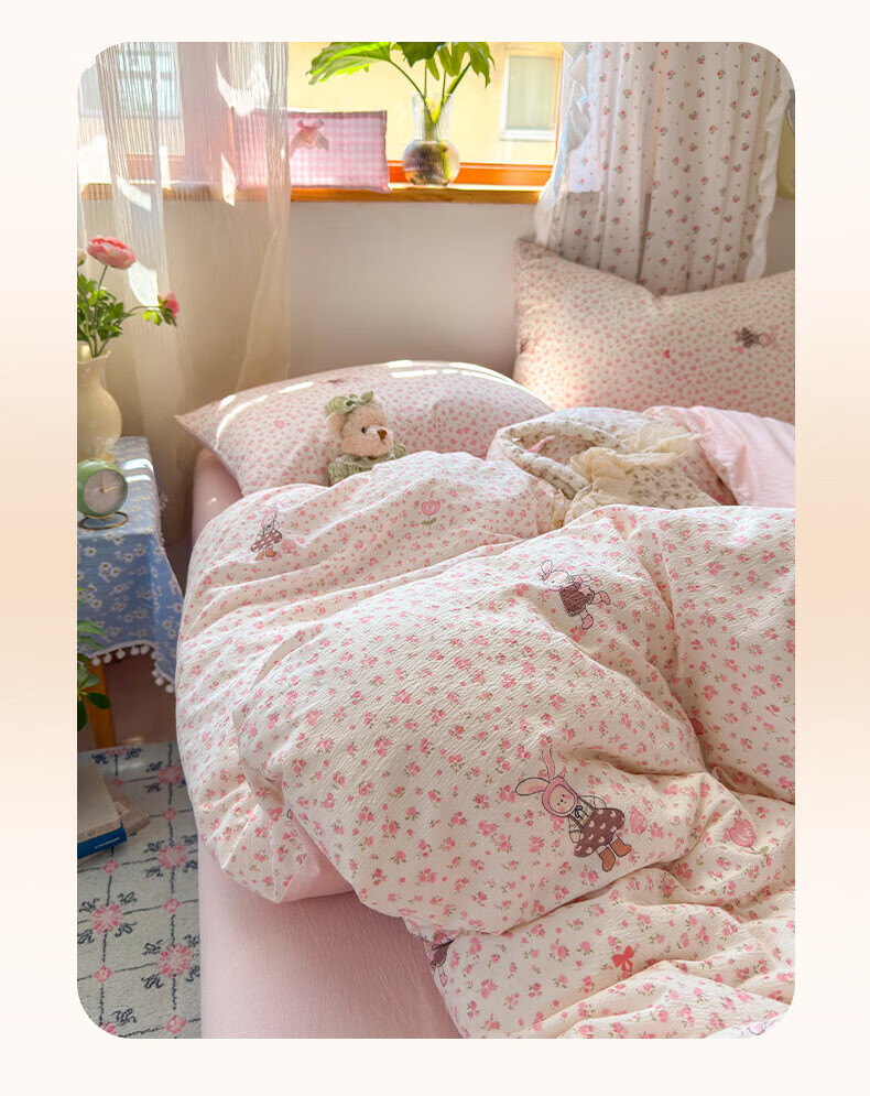 一默四件套被套床单床笠枕套A类可裸睡床上用品云感双层纱印花四件套 樱桃布丁 2.0m 床单款 (被套200*230cm) 四件套