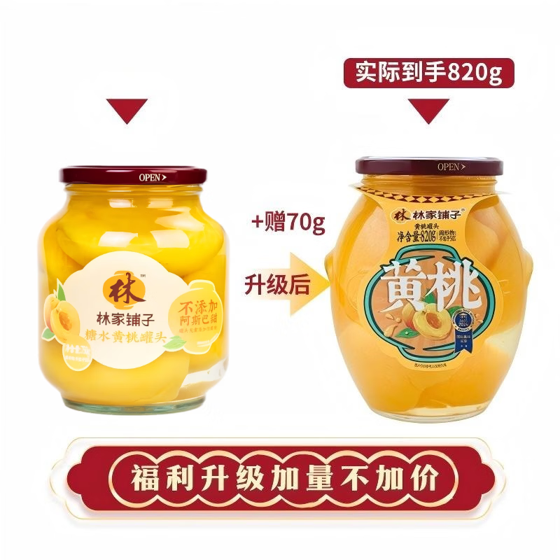 林家铺子黄桃罐头750g水果罐头纯糖熬制品牌爆款商超同售送礼礼品 【黄桃750g增量装+70g】*2罐 保质期至26年9月