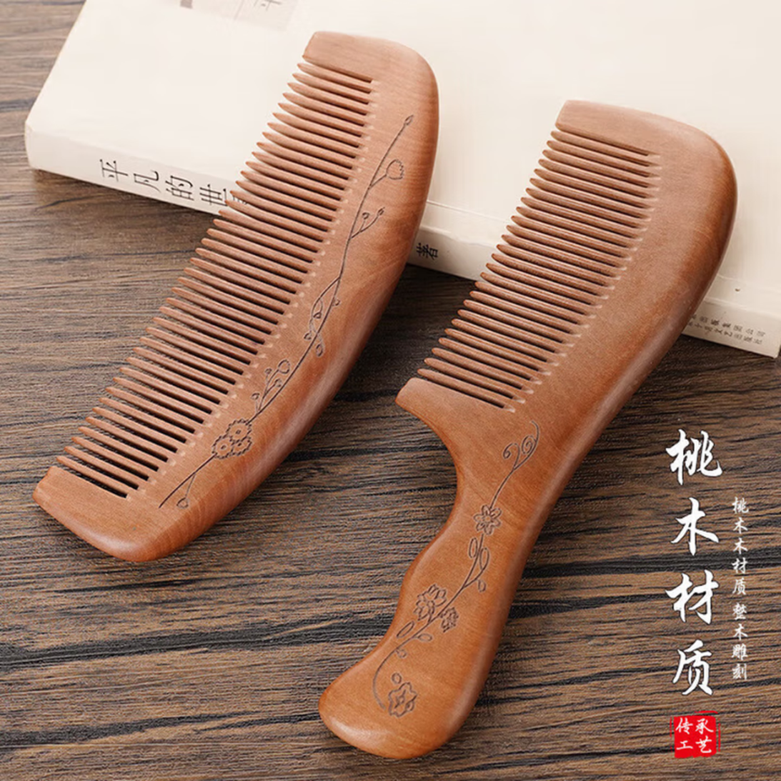 天然桃子家用木头小静电脱发檀香檀木牛角防男女长发专用 两把