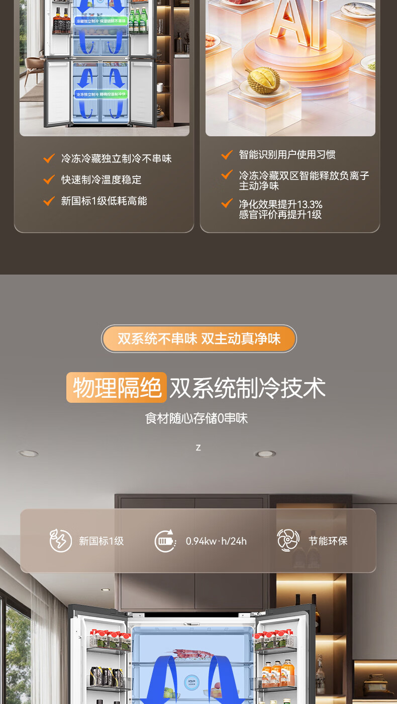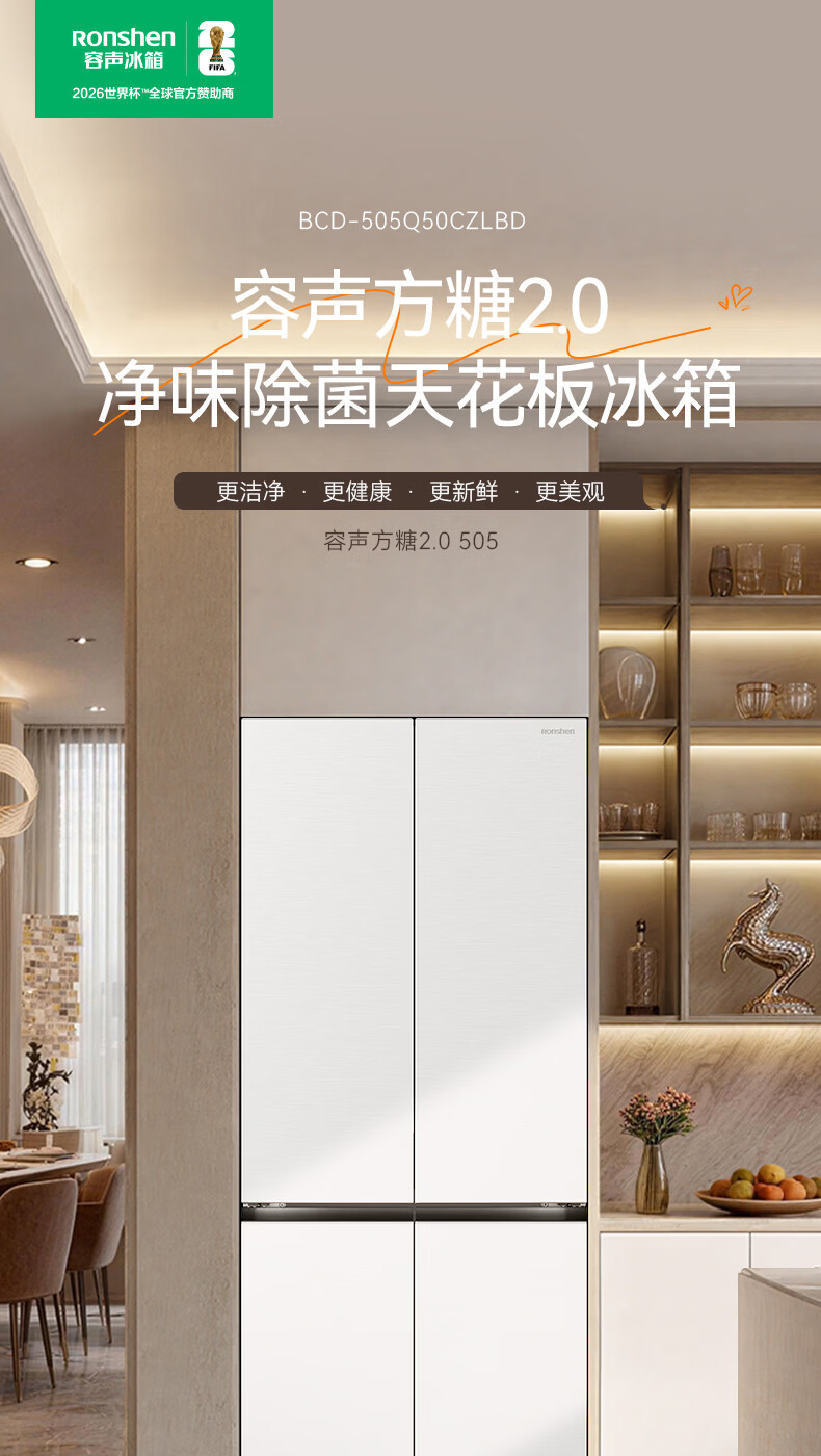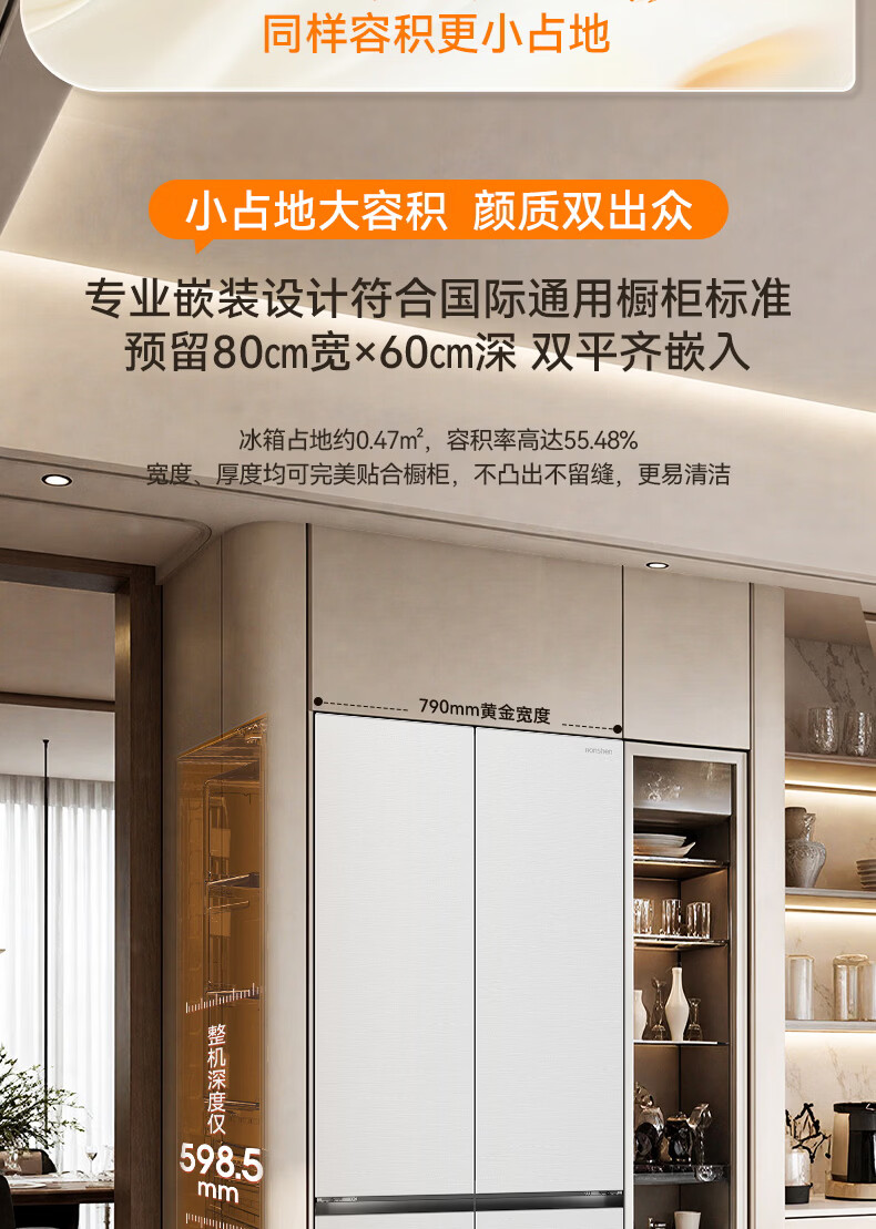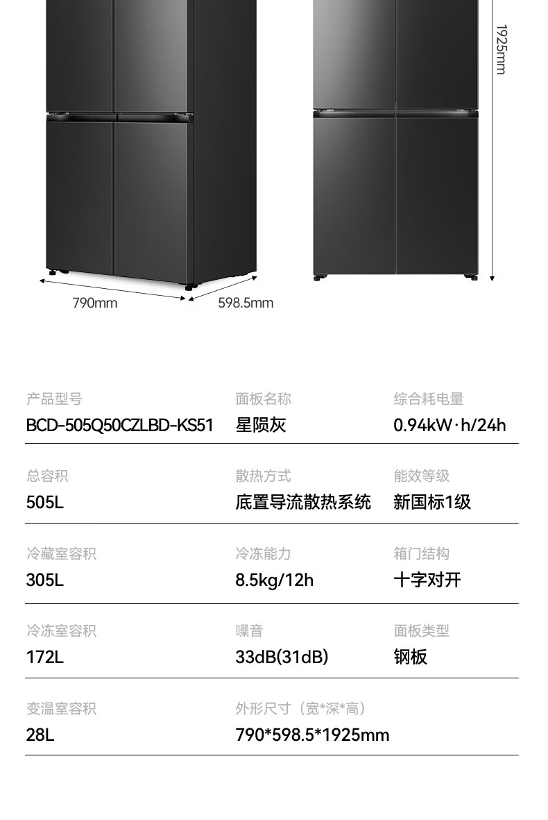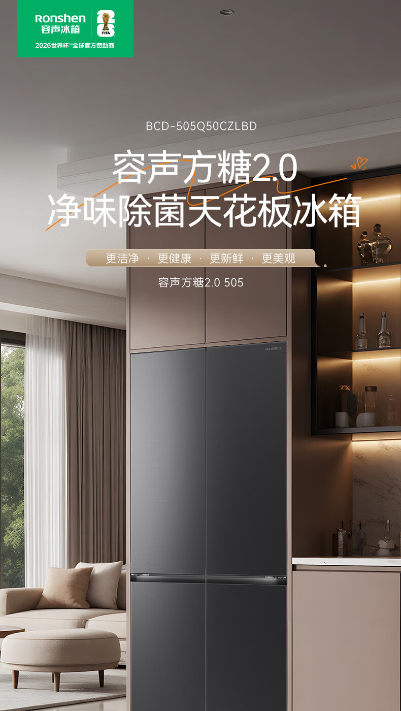 容声【方糖2.0】505L十字门冰箱双系统循环主动除菌超薄嵌入式一级能效无霜大容量国家补贴 BCD-505Q50CZLBD灰