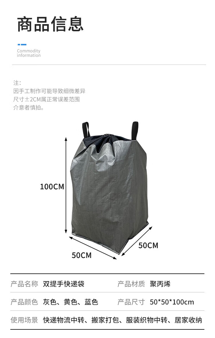 胖袋袋双提手搬家打包袋子加厚快递袋周转袋 黄色50*50*100cm