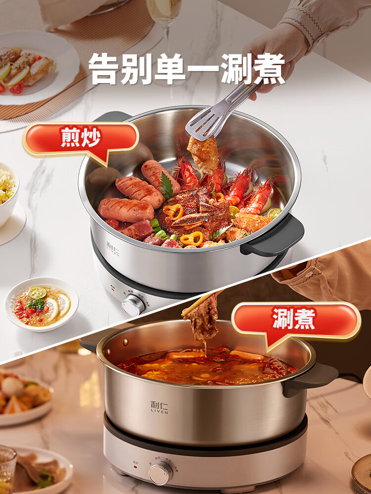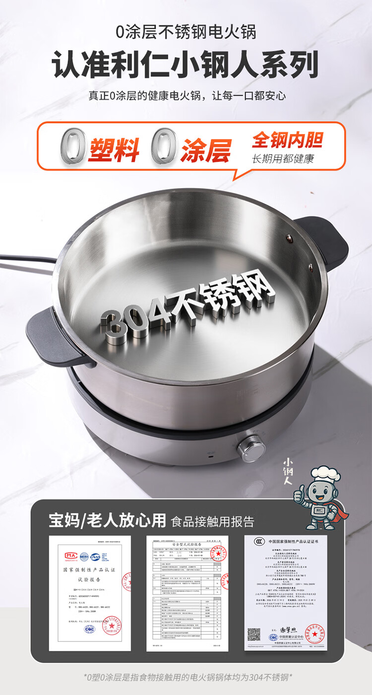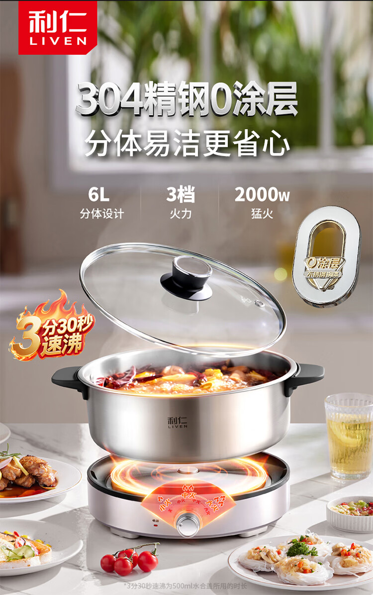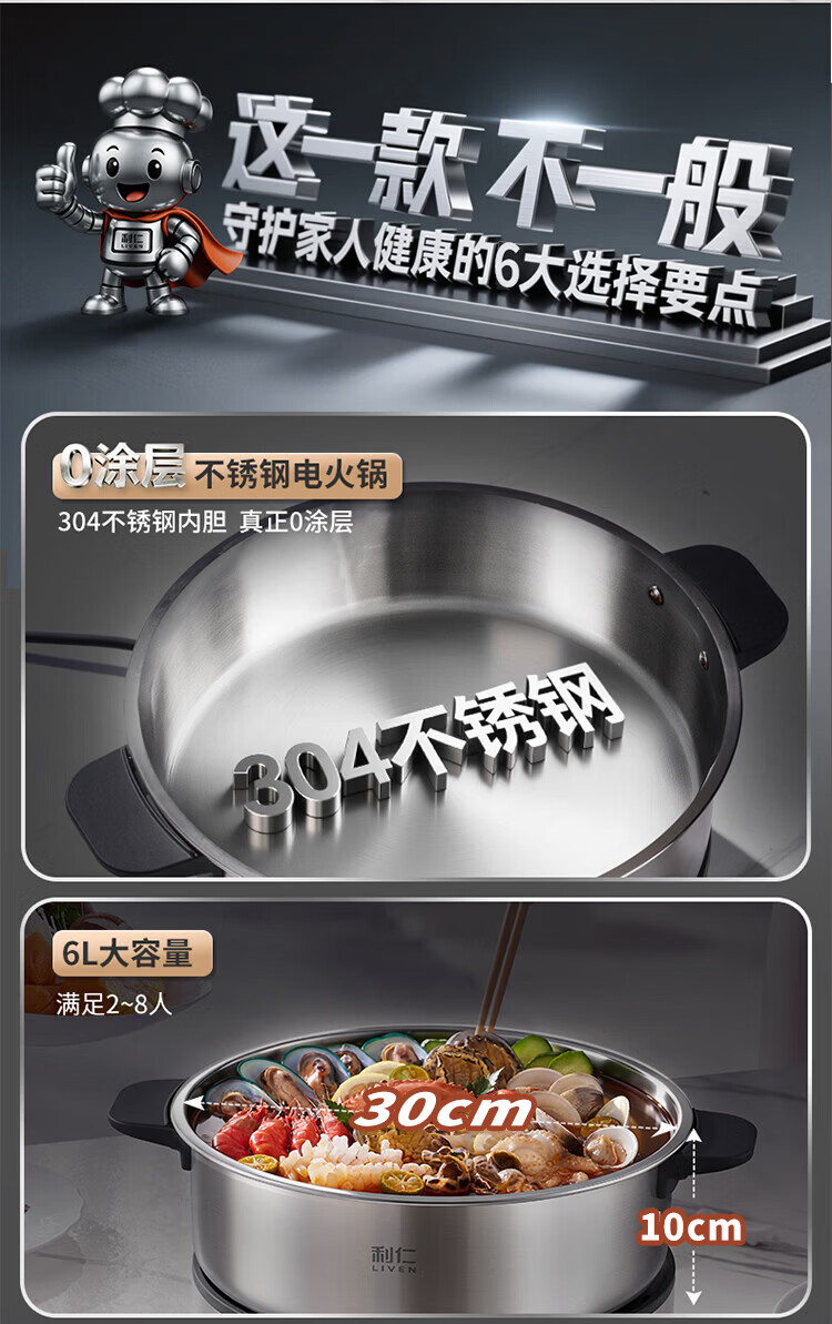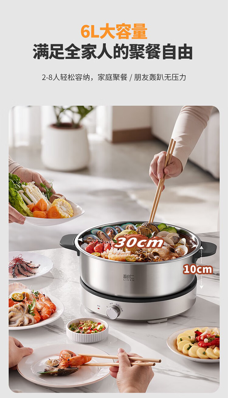利仁(Liven)小钢人0涂层电火锅不锈钢火锅专用锅分体可拆全钢速沸电热锅多功能锅6L电煮锅多用途锅DHG-J6220