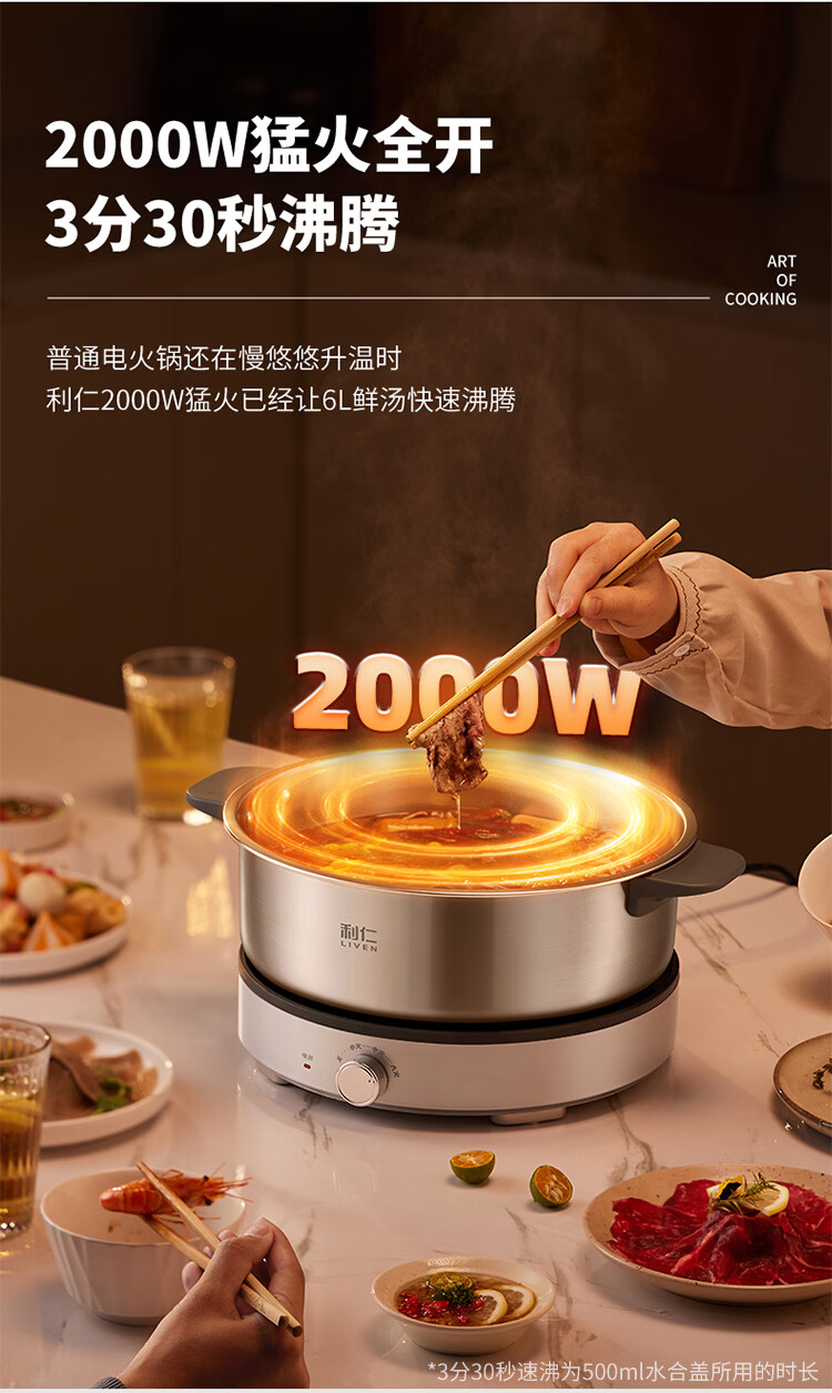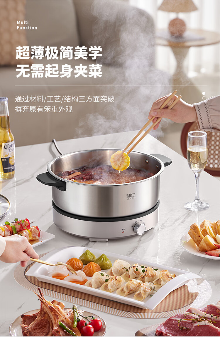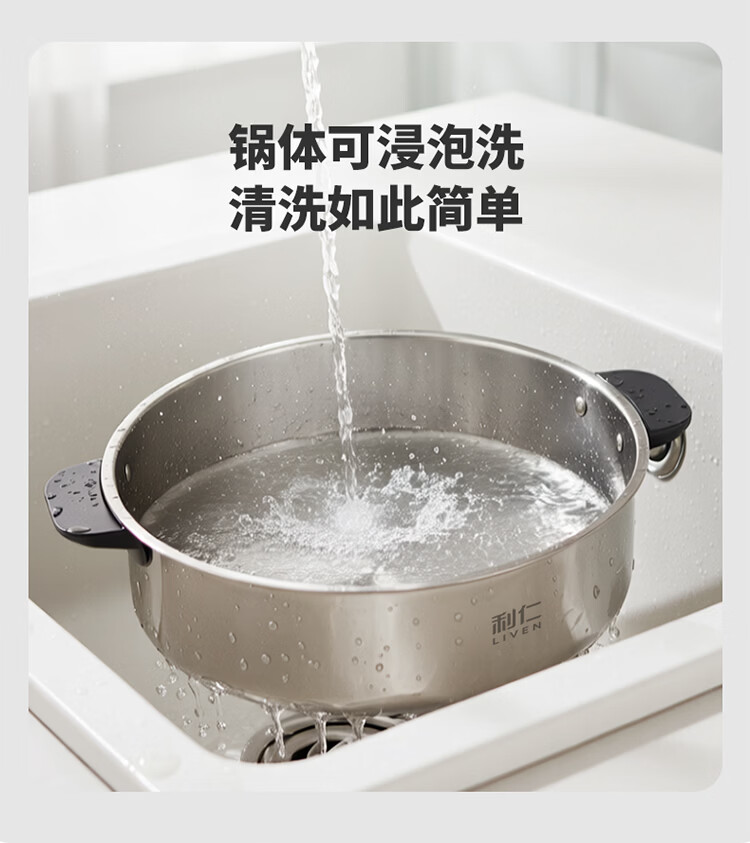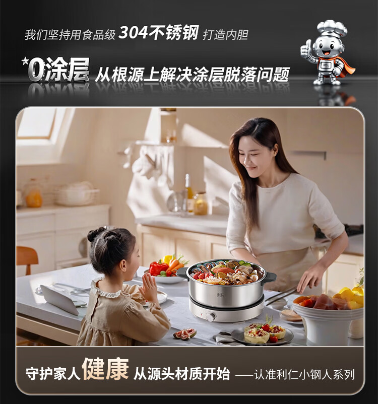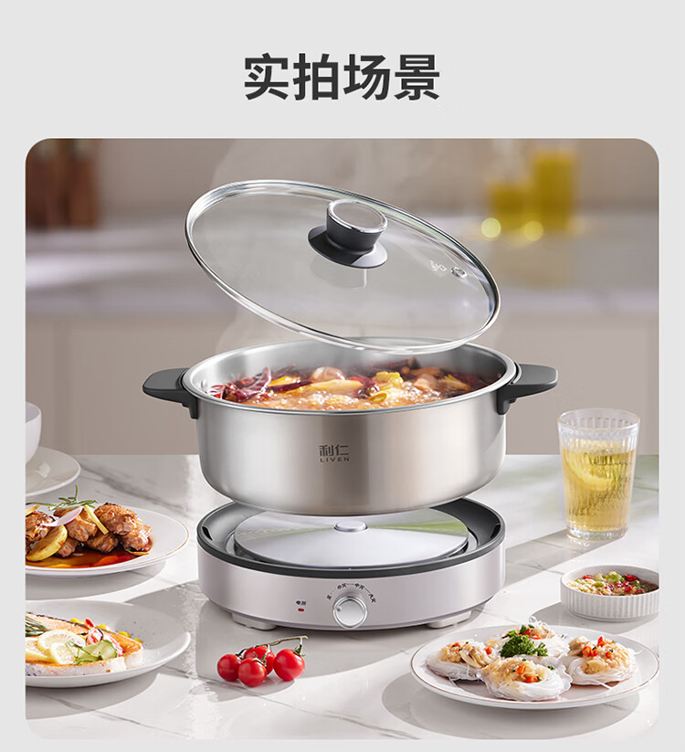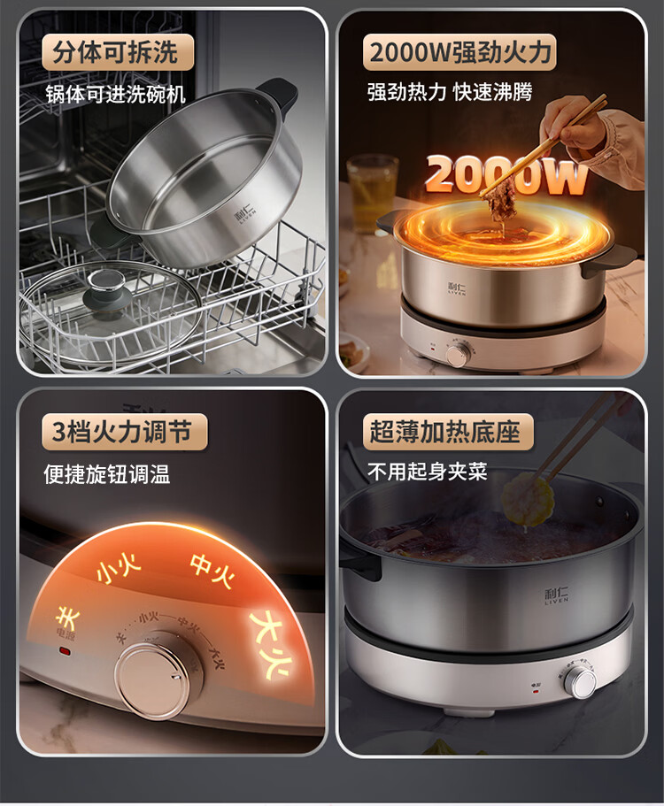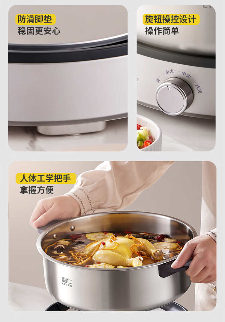 利仁(Liven)小钢人0涂层电火锅不锈钢火锅专用锅分体可拆全钢速沸电热锅多功能锅6L电煮锅多用途锅DHG-J6220