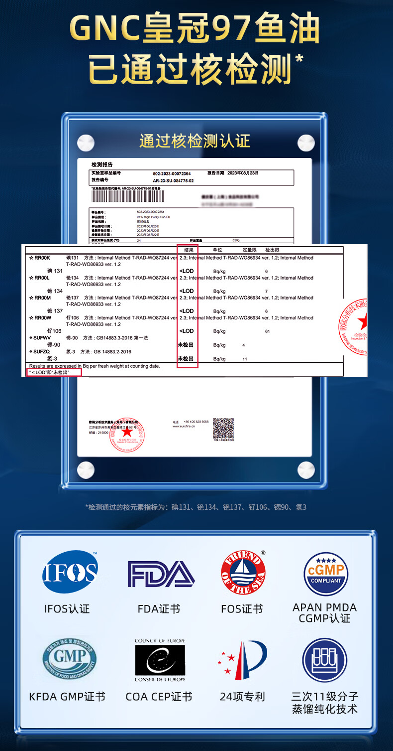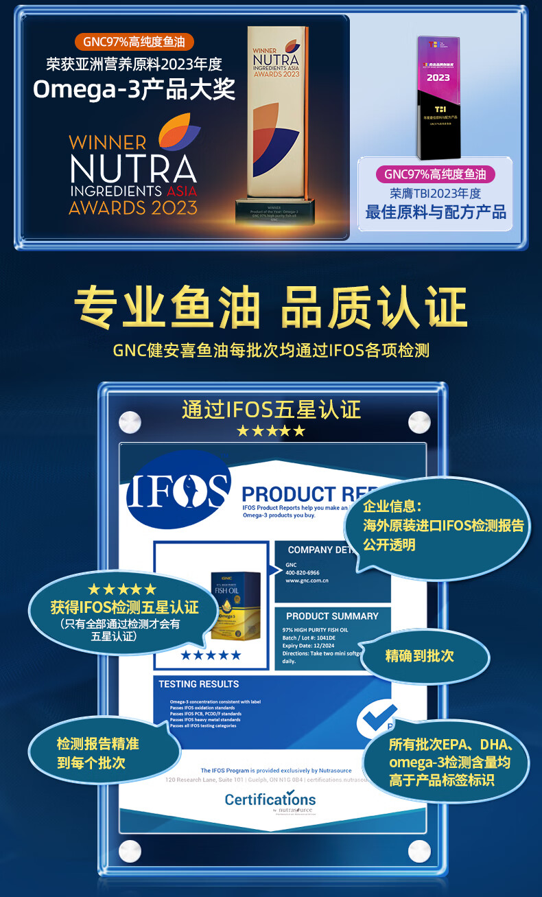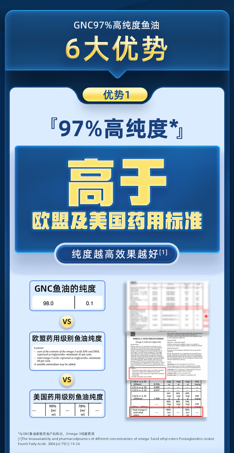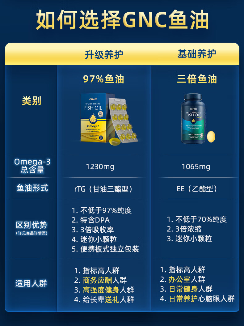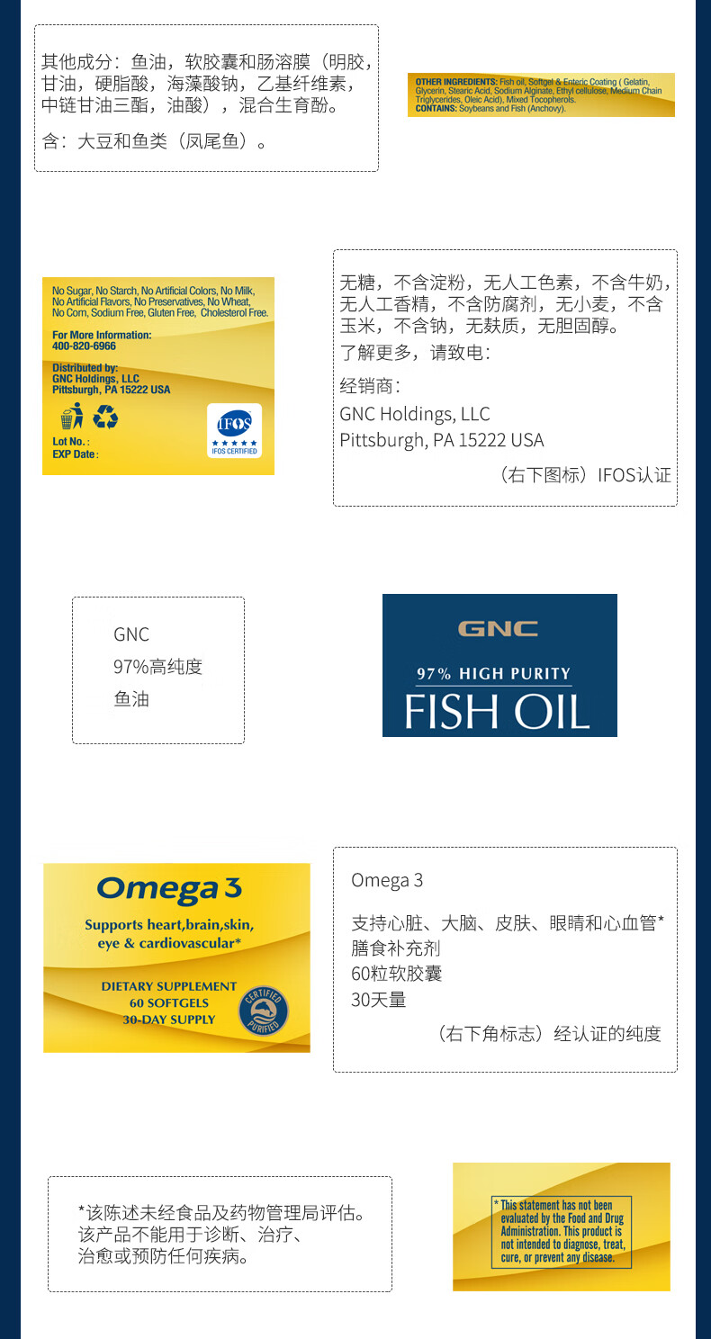 GNC健安喜皇冠97鱼油高纯度迷你易吞服60粒便携呵护心脑眼