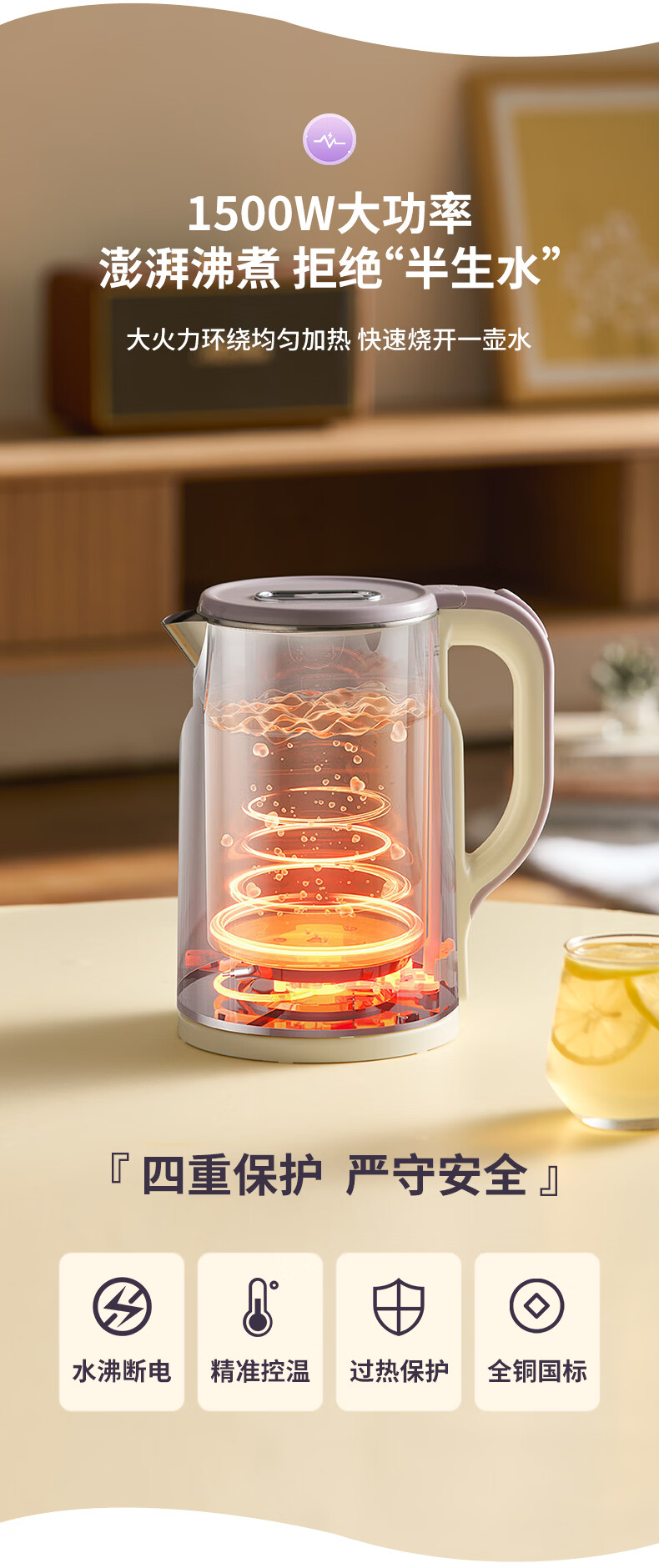 西可养生壶全玻璃大容量花茶壶0胶水0金属恒温煮茶器办公室热牛奶神器保温壶家用烧水壶电热水壶1.5L