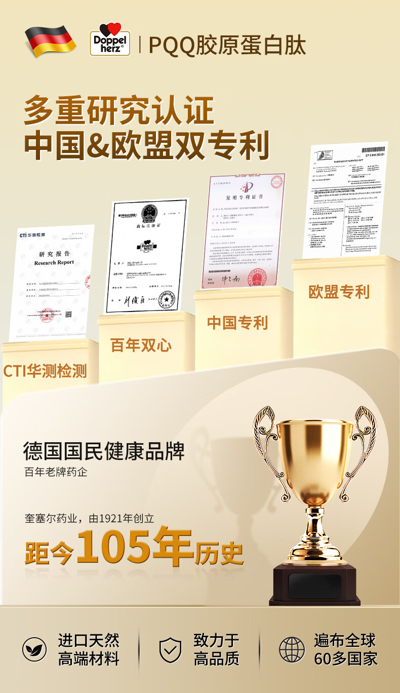 双心(Doppel herz)PQQ胶原蛋白肽抗衰老紧致皮肤保湿含金顶侧耳玻尿酸 尝鲜装 10支*1盒 【拍2送5支】