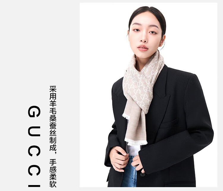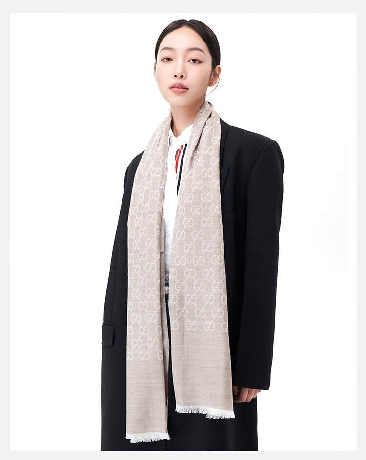 古驰(GUCCI)男女同款双G双面提花羊毛流苏围巾 浅驼色 165904 3G646 9500