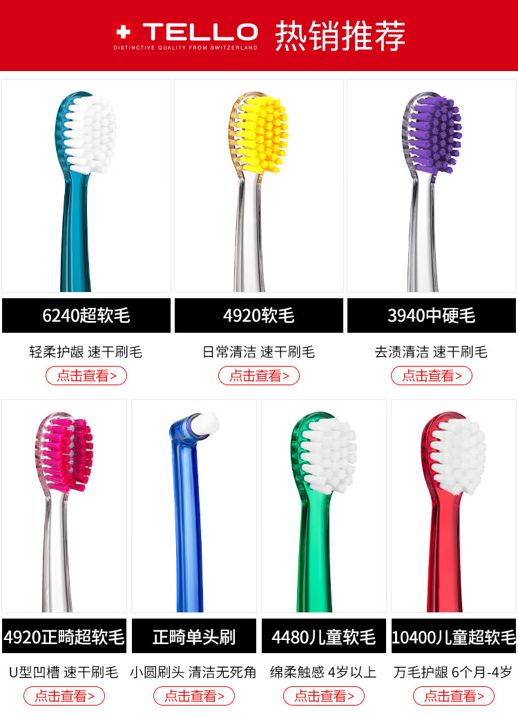 TELLO瑞士进口泰尔乐儿童牙刷软毛细毛4-6-12岁大童学生小头牙刷换牙期 【颜色可备注】2支组合