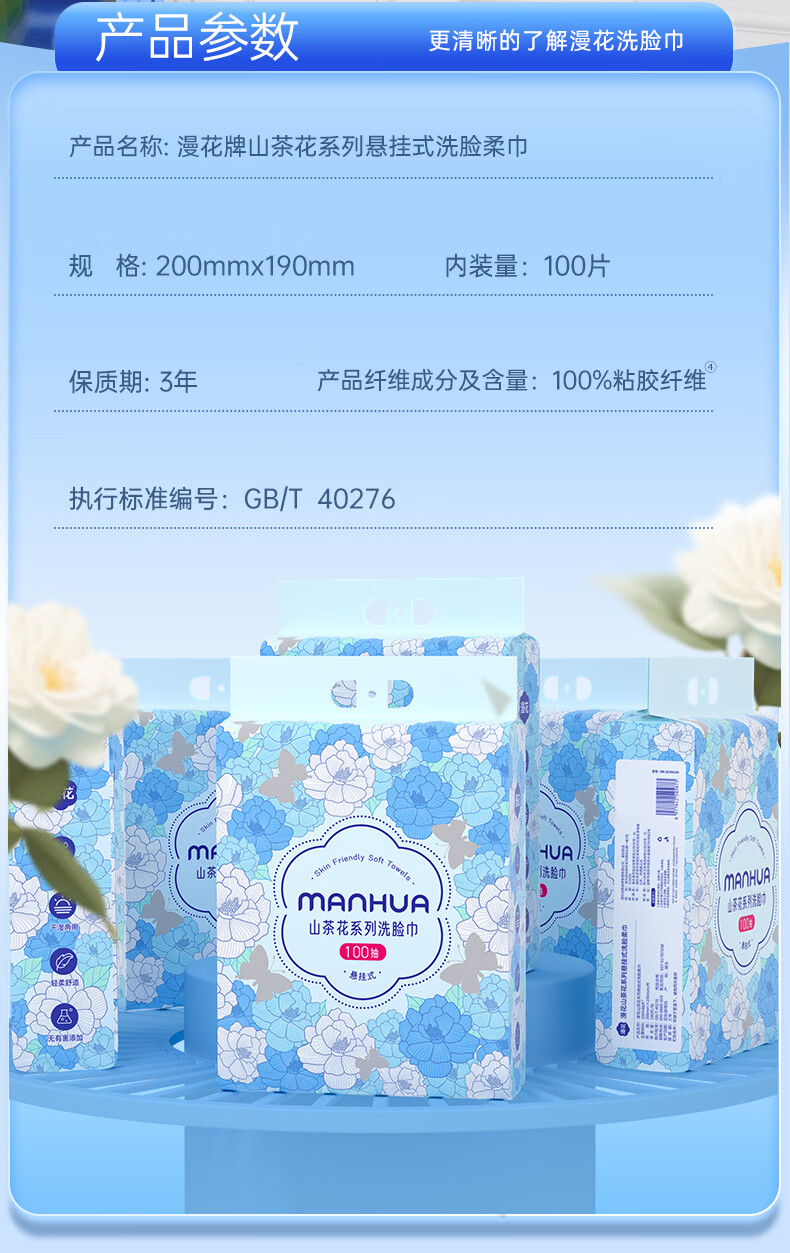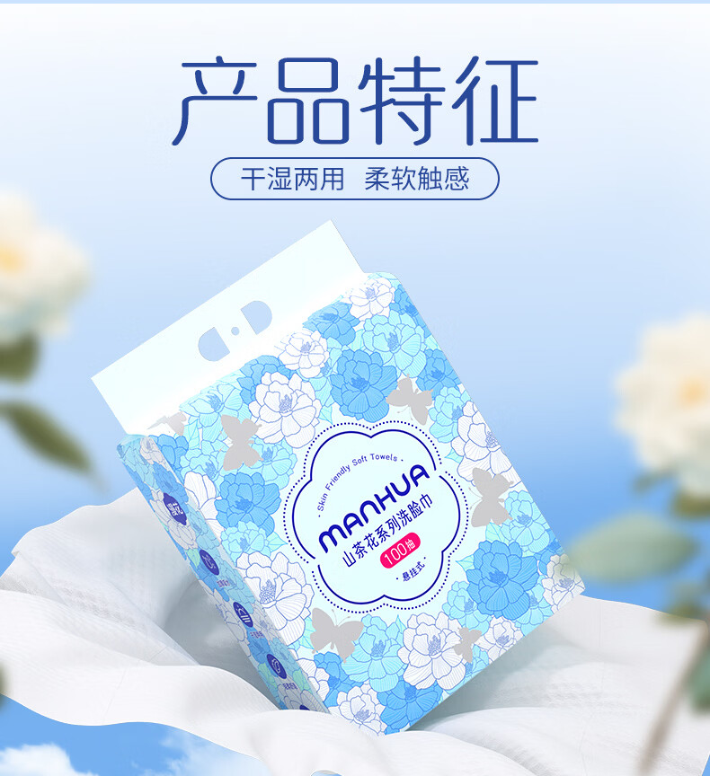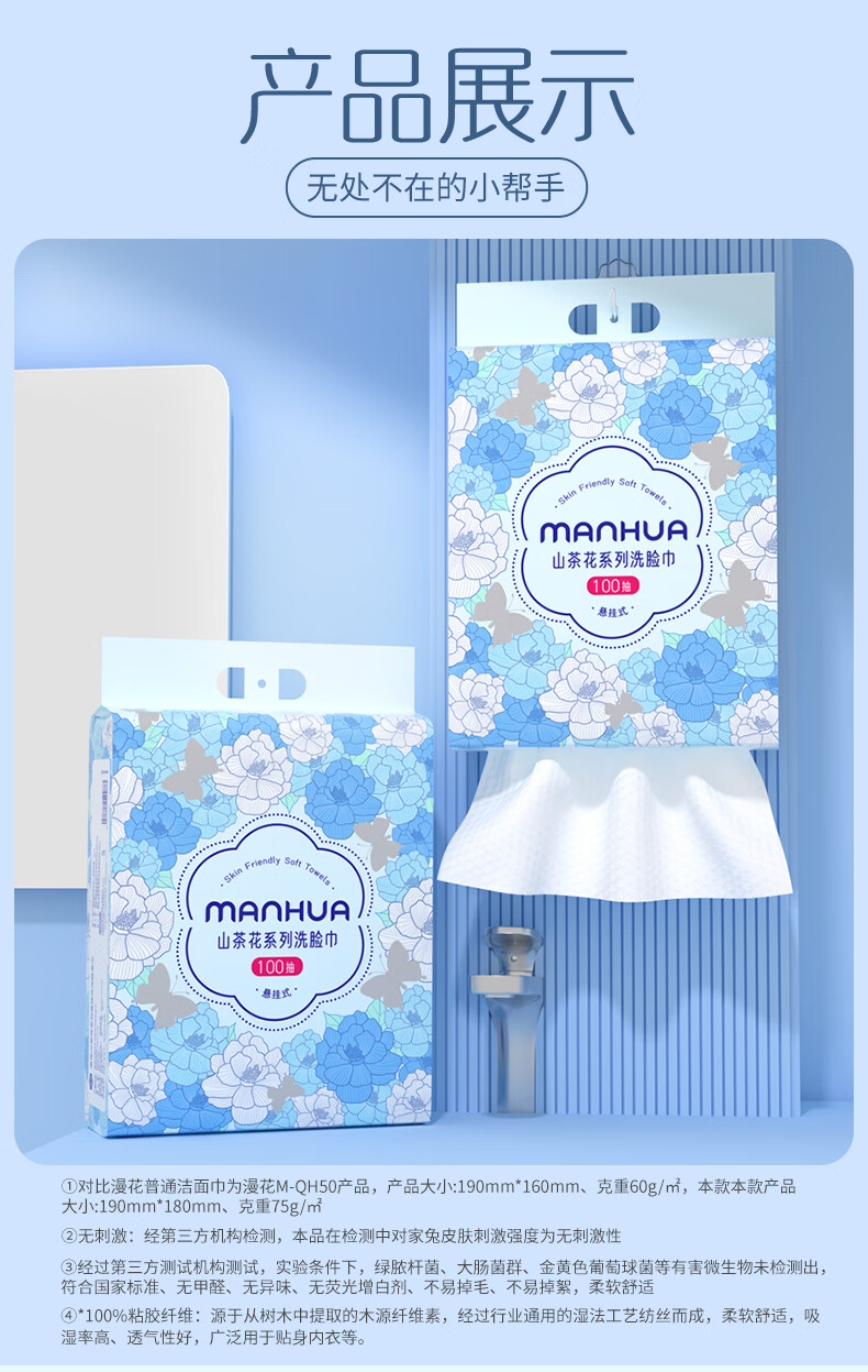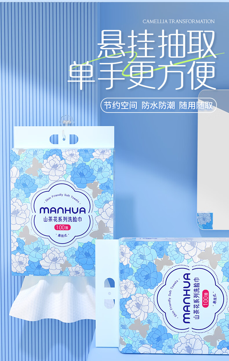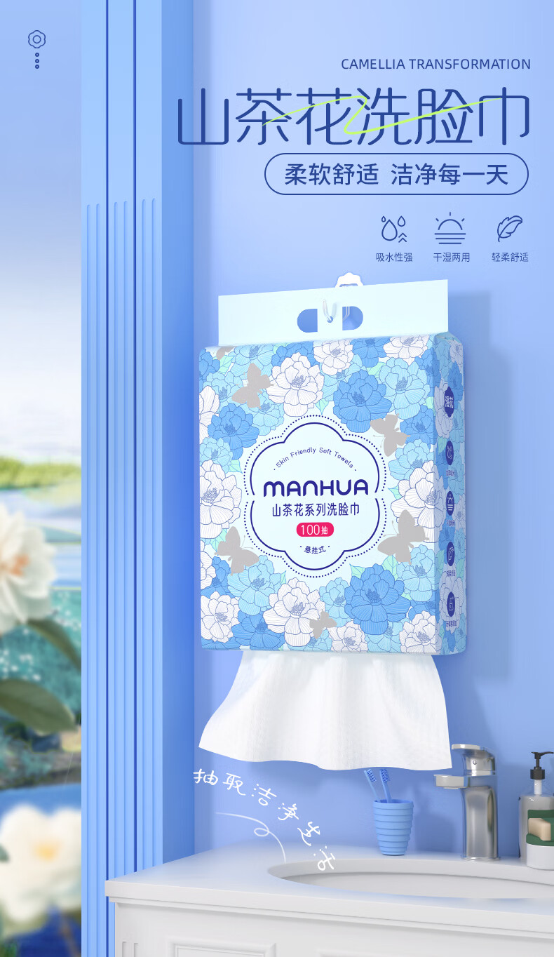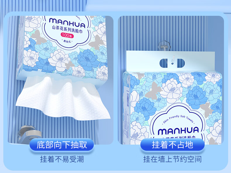 漫花山茶花加大加厚一次性洗脸巾悬挂式棉柔巾干湿两用擦脸巾 【山茶花洗脸巾】100抽*2提